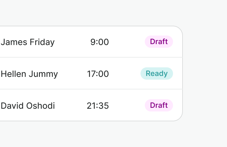 - "Draft," "Pending," or "Published" on a document or a blog post to show its current state in a workflow.