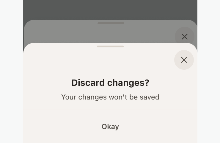 - Close button: Located in the header and always mandatory to support users who are unfamiliar with gestures and screen readers for having a clear focus.