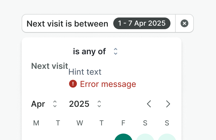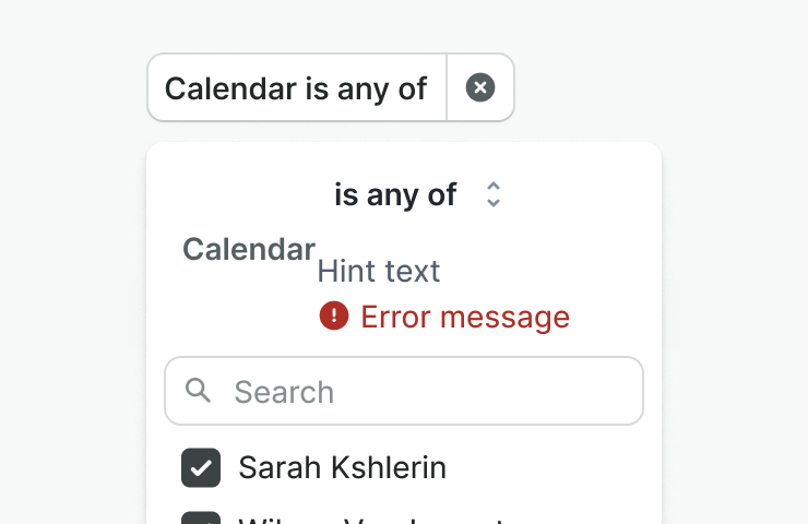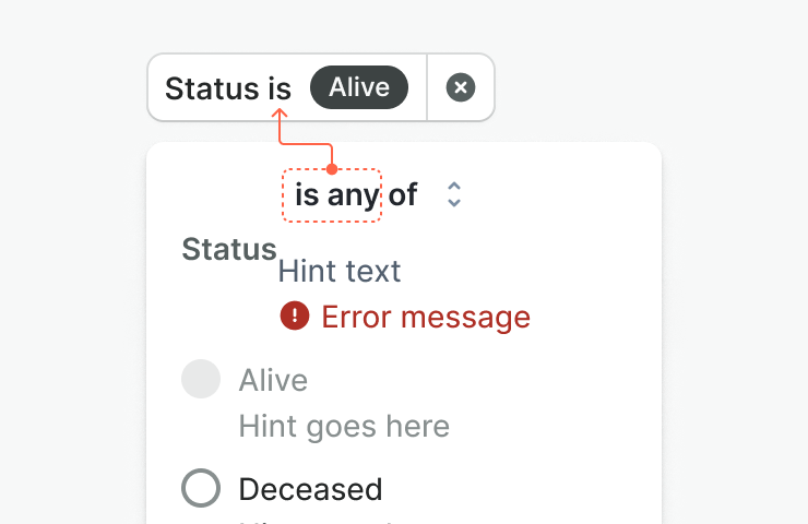 Users select a logical operator to define how the filter compares values. It updates the same way as the filter content—either instantly or on apply, based on the component’s apply mode. A default operator should always be provided. If only one operator is available, it’s displayed as plain text instead of a select menu.